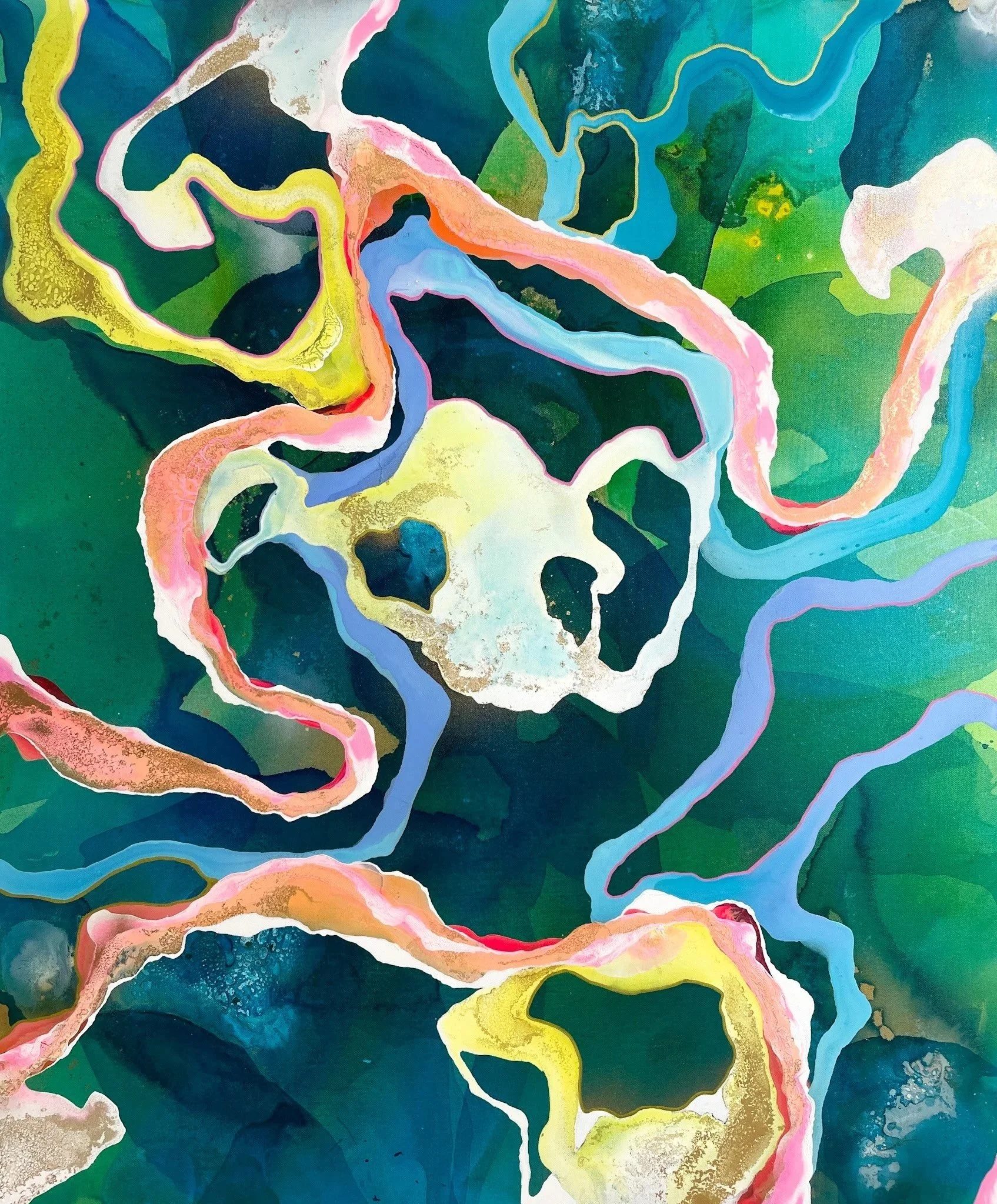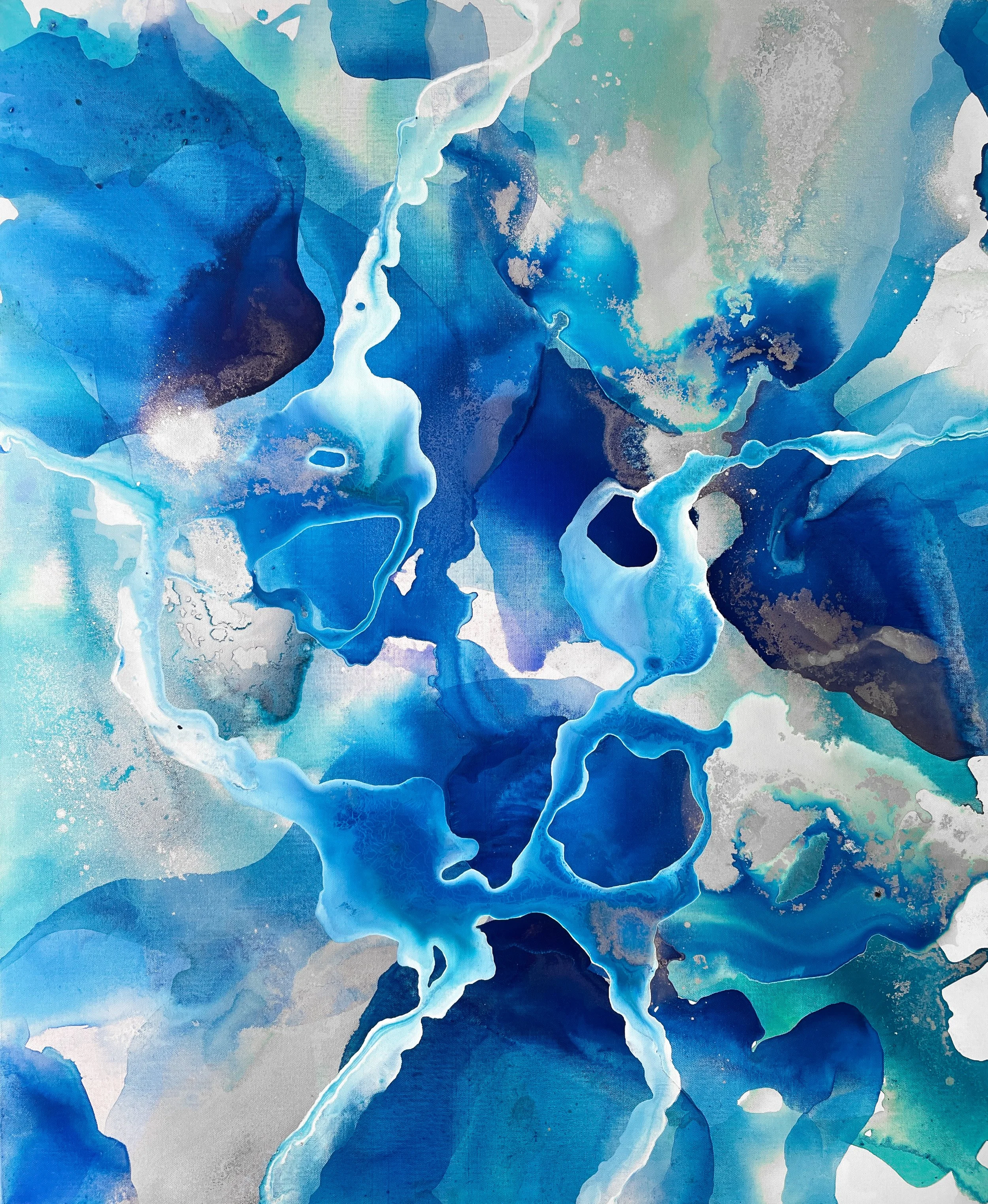 Was ist eigentlich Kunst? Was bedeutet sie? Welche Bedeutung hat meine Kunst für mich selbst? Abstrakte Gemälde, in denen ich die Welt von oben darstelle. Organische Flüsse und Farbverläufe in Kombination mit Komplementärfarben. Es symbolisiert die Unendlichkeit. Kein Anfang, kein Ende und doch eben diesen Moment. Als großes Ganzes und mit vielen kleinen Details, in denen man sich immer wieder verlieren kann. Alles ist im Fluss und in ständiger Bewegung, in einem natürlichen Einklang. Die Komplementärfarben als Kontrast und als Zeichen der Vielfältigkeit. Gleichzeitig stehen sie als Zeichen des Ausgleichs. Gegensätze ziehen sich an und es kann immer wieder Neues entstehen. Werden, Sein und Nichtsein als Symbol der Zeit. Der Kreislauf des Lebens. Wo befinden wir uns? Wo befinden wir uns als Kollektiv? Wo befinden wir uns als Individuen? Jeder von uns ist Teil des großen Ganzen und bestimmt somit die Richtung des Flusses. In welche Richtung fließt dieser Fluss? Wo kommt er her, wo geht er hin? Und wo befinde ich mich?...